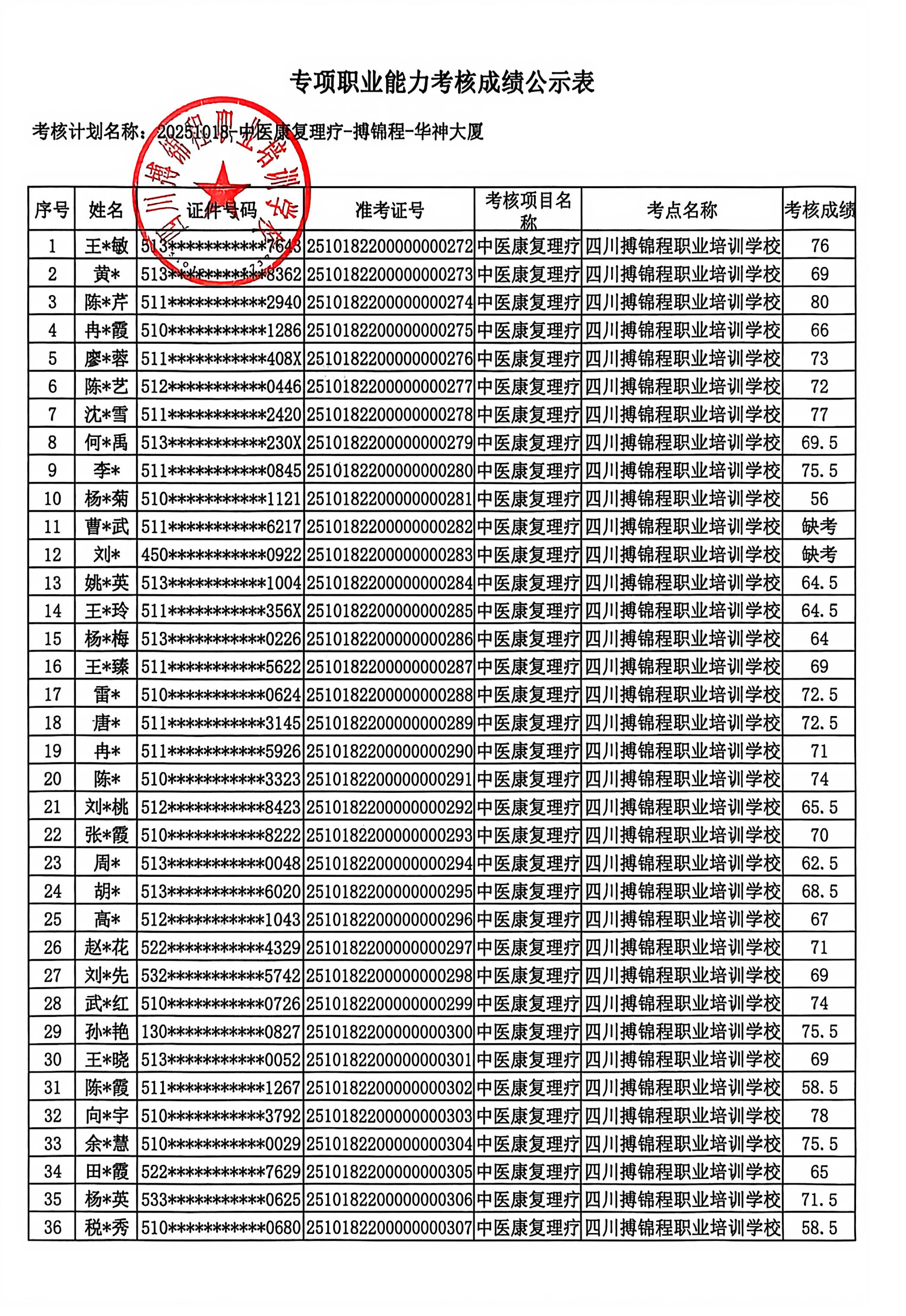 据四川省职业技能鉴定指导中心《关于进一步加强技能人才评价质量管理工作的通知》(川人社职鉴【2023】5号)要求,现将20251018-中医康复理疗-搏锦程-华神大厦第九批专项职业能力考核成绩进行公示。